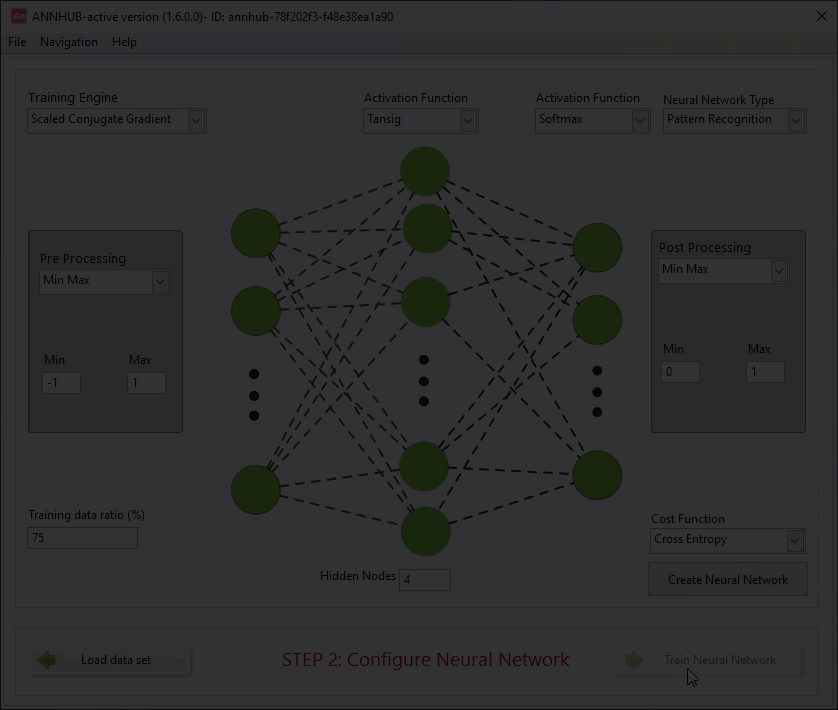 • In this step, ANNHUB will auto-suggest the neural network type and parameters based on the imported dataset, or you can adjust the setting to achieve the best result.