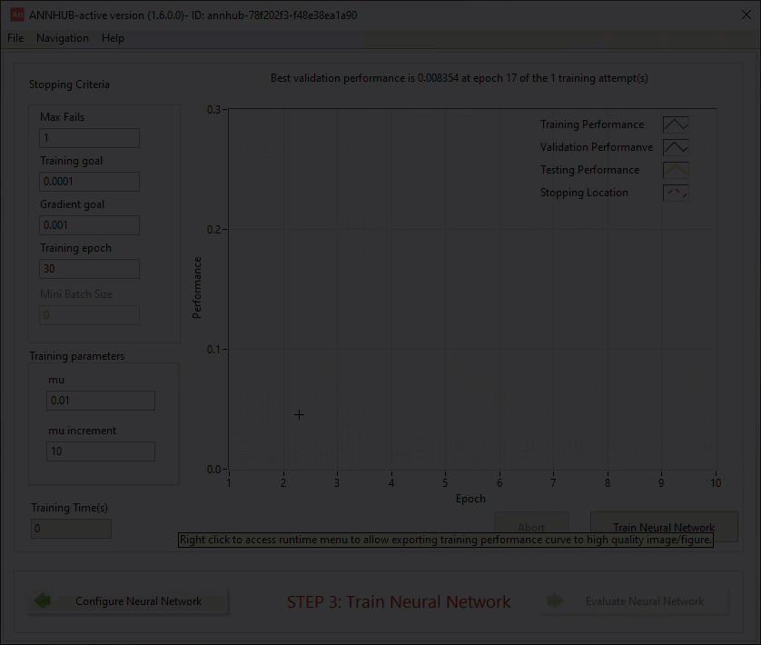 If the Bayesian Regularization training algorithm is selected, the evaluation information for the validation set will not be displayed as that dataset is not required.