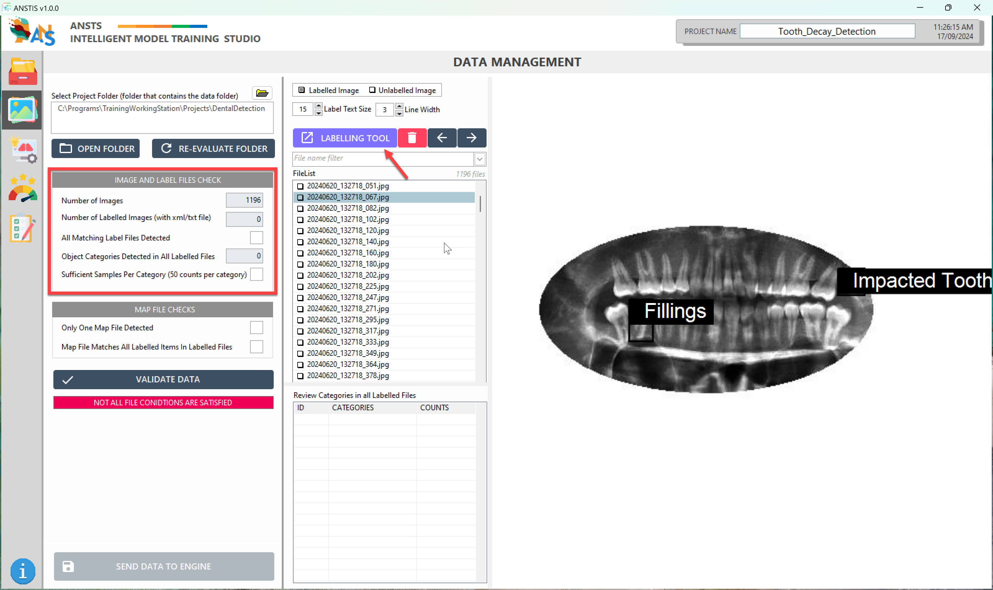 On the left side panel, check the Image and Label File dialogue to confirm the dataset has sufficient image and label files. If your dataset doesn't have label files or has label files in different formats, you can use the ANS Labelling Tool for instruction.
