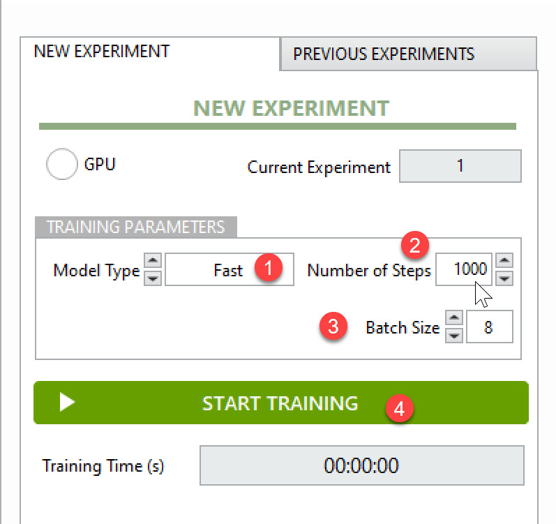 After sending data to the engine, you need to set up the training parameters to start a training experiment. Each training experiment will produce a specific AI model based on the chosen parameters. This means that a project can have multiple models of the same dataset, depending on the number of experiments.