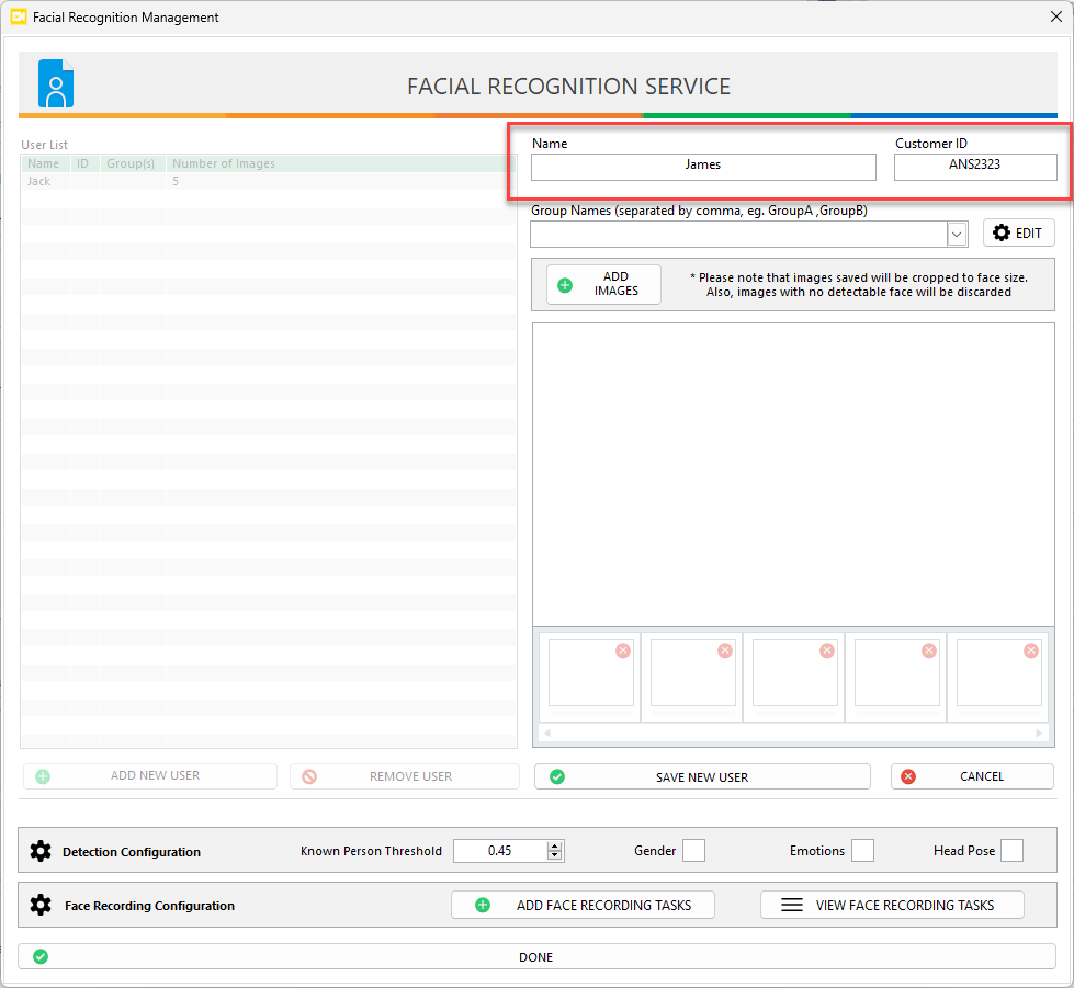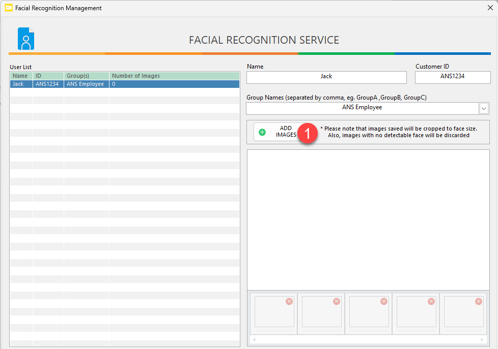 Select the user you want to assign face images to and click Add Images to upload face image from your local drive