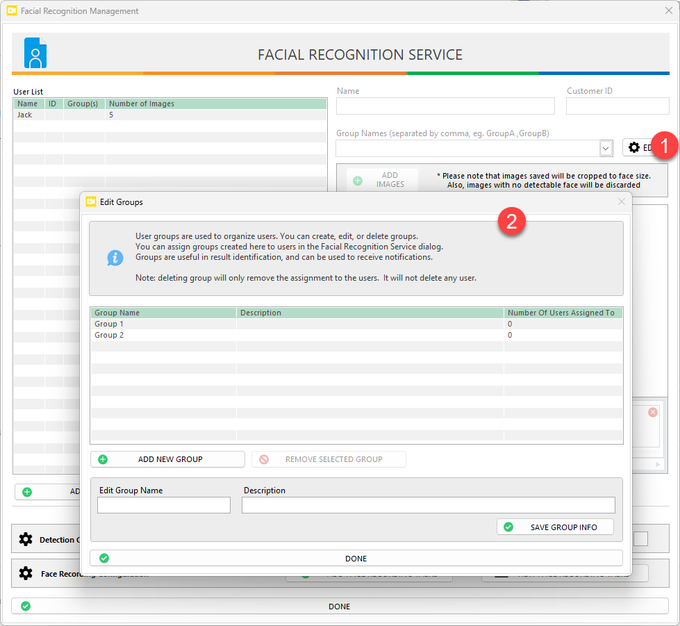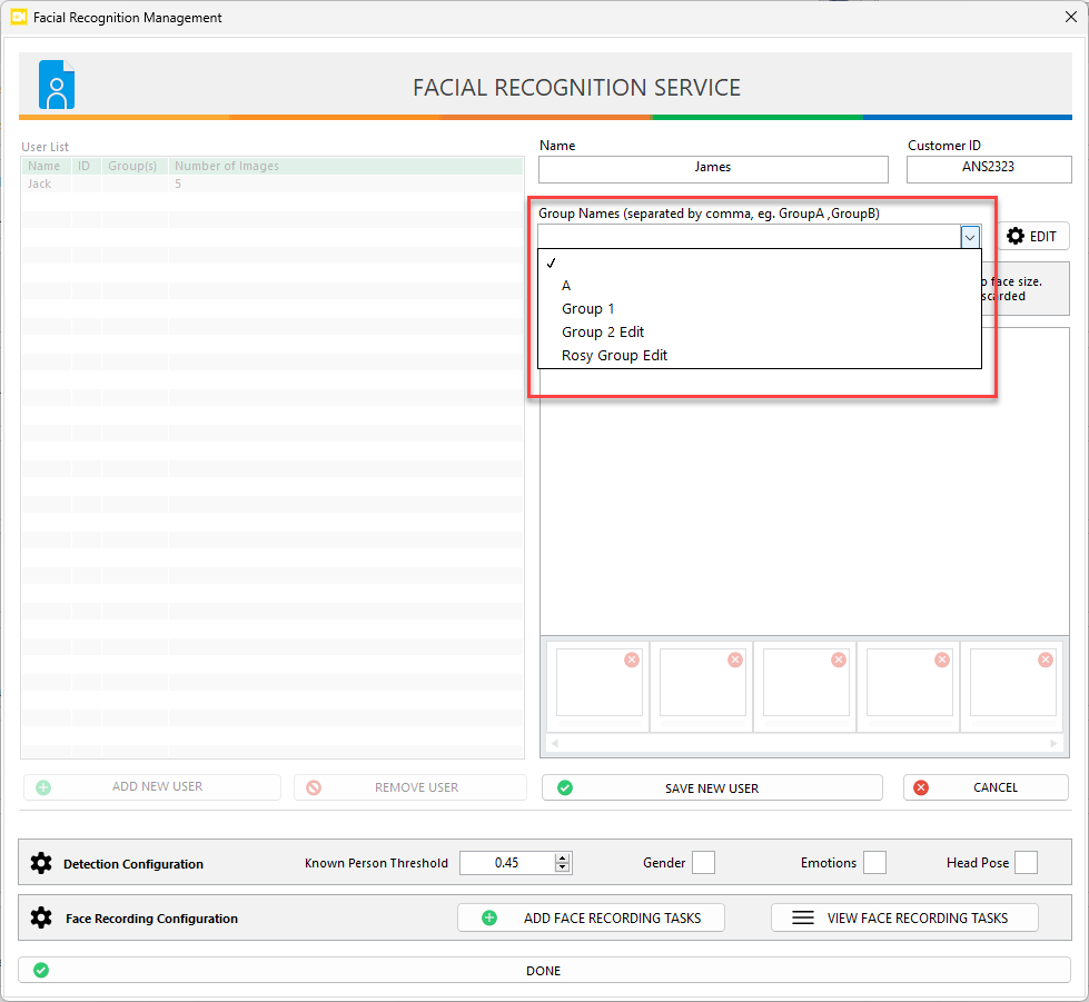 The Facial Recognition Service enables users to add users, capture face images for face registration, create face groups, adjust face threshold sensitivity, and activate additional face attributes such as gender and emotion for your Facial Recognition tasks.