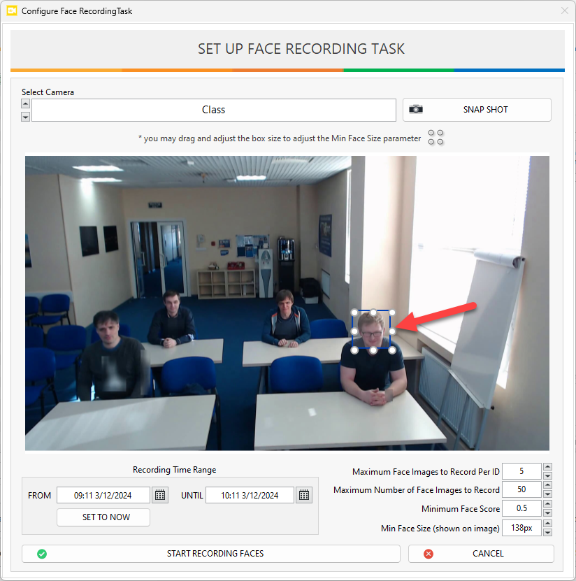 • Min face size: set the minimum face size to capture in pixel, you can use the rectangle shape in the image to drag and drop the min face size.
