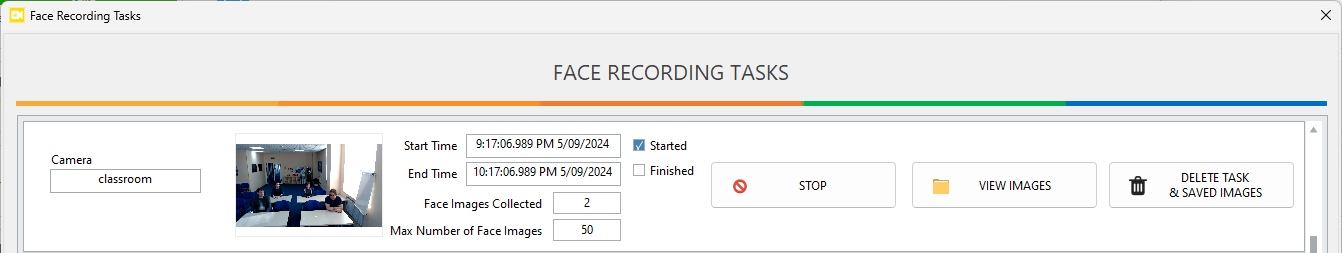 The conditions for the task to stop are either the recording time has elapsed, or the maximum number of face images has been reached. You can also stop the task manually by pressing the Stop button.