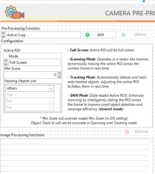 The Active Crop feature is designed to dynamically adjust the region of interest (ROI) based on the active ROI mode you choose, ensuring that the AI system always analyzes the most relevant area.