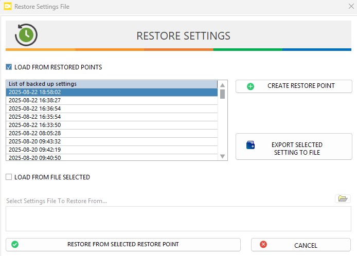 Press Export selected setting to file to export any restore point from the list into a file. The file can then be imported and applied on another ANSVIS server, simplifying migration or replication.