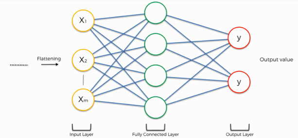 The dense or a fully connected (FC) layer provides all connections between nodes. This module is normally used as hidden or output layers after the Flatten layer