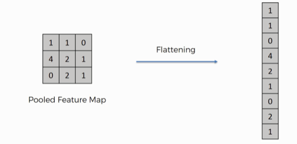 Flatten node converts the output of the 2D convolutional part into a 1D feature vector that can be used to have it processed further, such as using a Dense node.